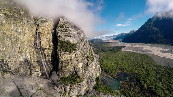 Spruce tree island on the side of the Mile-High-Cliffs, looking up the Nizina River in Wrangell St. Elias National Park, Alaska.
